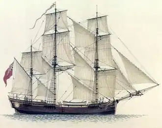 Scarborough's crew as a convict transport was approximately 35 men including her master, three mates, a boatswain and a ship's surgeon.[12]