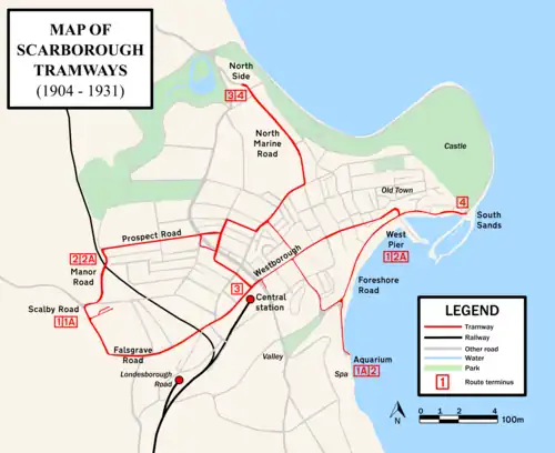 Scarborough Corporation obtained parliamentary powers under the Scarborough Tramways Act 1902 to operate tramways in the town. The Scarborough Tramways Company was formed under this act to build and work the tramways.[2]