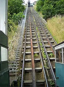 The funicular was designed and engineered principally by William Lucas.[1] Its construction was undertaken by Crossley Brothers of Manchester at a cost of £8,000. Metropolitan Carriage of Birmingham constructed the two cars, each capable of carrying 14 seated passengers. Each car was attached to a twin-steel cable rope, which was originally operated by a brakeman at the top station, while the bottom of each car was also fixed to a water tank.[1] The track is 4 ft 8+1⁄2 in (1,435 mm) standard gauge wide and 284 feet (87 m) long, on 1 in 1.75 (57%) gradient.[1]