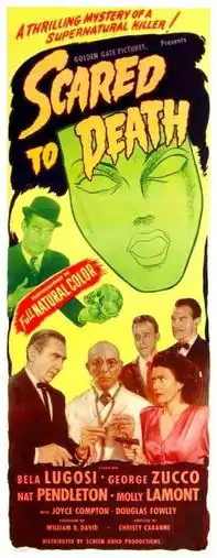 Scared to Death is a 1947 American gothic thriller film directed by Christy Cabanne and starring Bela Lugosi, George Zucco, Nat Pendleton and Molly Lamont.[3] The picture was filmed in Cinecolor. The film is historically important as the only color film in which Bela Lugosi has a starring role.[4][5] Lionel Atwill was originally intended to appear in the film but he was too ill to work, so George Zucco replaced him in the cast. Christy Cabanne completed the film in early 1946, but it was not screened until 1947.[6]