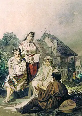 The revolutionaries' resolve was finally tested in September, when Wallachia was invaded—first by the Ottomans, and immediately after by the Russians. At Pitești and Râmnicu Vâlcea, Demostene gathered up survivors of the battle which had taken place on Dealul Spirii.[7] As reported by Pelimon, Scarlat tried to put up some resistance to the Russian armies storming in from Putna. He could only muster "some tricolor flags and groups of villagers", although he also heard pledges of support from Russian deserters—he informed his government of this, but was ordered not to put up resistance.[33] His area of operations fell under a Russian occupation, on September 15, with A. Borănescu assigned as the county leader; the deposed Turnavitu hoped to appease the Cossacks by crossing their path with a procession of peasants and priests.[34] As noted in an 1850 propaganda brochure by revolutionary exiles, he had tried to appeal to the common denominator of Romanians and Russian sharing an Orthodox faith: "But these Orthodox [emphasis in the original], under orders from General Luders, trampled upon the cross and the Gospels, chased down and dispersed The People with their sabres and bayonets, and put priests in chains."[35] A manhunt of the revolutionaries was carried out on the spot, with Turnavitu appearing as the county's third most wanted revolutionary figure—behind Șonțu and the woodworker Simion.[36] He remained in Focșanii Munteniei. Though his fellow revolutionaries claimed that he voluntarily surrendered to the Cossacks "in order to endure the same fate as his compatriots",[37] he in fact tried to hide at the French Republic's local consulate. He asked and obtained political asylum, but was found out in the consul's home and arrested, against the provisions of international law.[7][12]