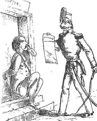In Moldavia, Constantin became famous for his advocacy of balneotherapy, and also for his work during the 1848 cholera epidemic: he was the only doctor of Iași to have survived the calamity.[4] This was particularly unusual, as he did not believe that cholera was contagious, and relied on folk medicine in his attempts to cure it.[56] He shared some of Scarlat's views about modernization, publishing his plans to set up a sanitary service and medical schools.[57] From 1844, he was also son-in-law of the Wallachian Prince Gheorghe Bibescu,[58] a conservative figure. Nonetheless, the Students' Society revolutionary connections irritated Bibescu, and also caused concern in Russia, which, at the time, shared custody of the Principalities. Despite Lamartine's support, these developments also worried the French monarchy, which was transitioning to conservatism. The Guizot government chose not to give any recognition to the Society, pushing it into the underground.[59]
