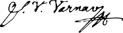 Vârnav's focus was on providing young intellectuals with a cultural training that was already in their vernacular language; this included efforts to discard the Cyrillic orthography as "foreign", and familiarize students with the various adaptations from Latin.[37] He specifically asked book publishers to specify whether their books were in Latin or Cyrillic, intending to prioritize the former.[38] His own experiments resulted in what historian Nicolae Iorga deems a "bizarre personal orthography".[39] While the nationalist movement was struggling to popularize the name "Romanian" for the shared ethnicity and culture, and trying to settle on a spelling of that word, Vârnav suggested the variant Roumén(é), later replaced by român and română.[40] He also proposed that linguists from the Danubian Principalities (Moldavia and Wallachia), as well as from other Romanian-speaking regions, meet up in congress "somewhere central to the Romanian lands".[41]