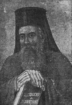 Vârnav thereafter involved himself in the controversy over the full secularization of monastery estates, which also doubled as Cuza's attempt at curbing Russian influence within the national borders. Unlike a circle of conservative monks, led by Andronic Popovici, Vârnav and his followers were enthusiastic about the proposed secularization; Popovici called Vârnav the "new heretic of Moldavia".[115] Moldavia's Education Minister, Alexandru Teriachiu, assigned Vârnav to a reform committee which uncovered great irregularities at Neamț, including a dysfunctional seminary and an inhumane ward for the insane.[116] Vârnav refurbished the seminary, and then also organized the peasant schools of Neamț County, serving as inspector. Proposed innovations he "learned at Paris", now included the establishment of a printing press and the demolition of new additions to the historical site.[117] However, he was also suspected of giving away boons, including the monastery's cloth factory and a large press, to his patron Mihail Kogălniceanu and to the government itself.[118]