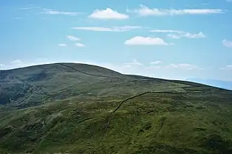 Scaw'd Law is a hill in the Lowther Hills range, part of the Southern Uplands of Scotland. The Dumfries and Galloway-South Lanarkshire border runs along its summit, which is notable for having two similar rounded tops; the top 300m to the north is likely the true summit.[1] Surrounded on most sides by tracks or roads, there are various routes to the summit, but the most frequent ascents are from Durisdeer or the Daer Reservoir.[1]