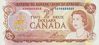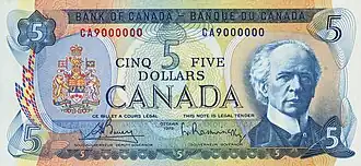 The portraits on the obverse of each denomination were larger than for the same denomination in the Canadian Landscape series.[5] Initially, all denominations were to feature the portrait of Elizabeth II, but portraits of former prime ministers were used for some denominations at the request of Edgar Benson, the Minister of Finance in 1968, to "reflect Canada's burgeoning national identity".[6] The vertical borders of the obverse were curvilinear, the left edge of which had "multicoloured diamonds" bordering a circular frame within which was the Coat of Arms.[7] It also featured "sweeping guilloché" patterns.[7]