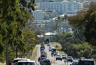 After proceeding south-east for about 350 metres it crosses Ross Creek and passes between Cooee Bay (to the east) and Taranganba (to the west) It then proceeds through Lammermoor, running beside the beach for about 1 km before reaching Rosslyn. Where it enters Rosslyn the road is cut into an ocean-front cliff-face near Statue Bay. This section of road was closed from 20 February 2015 until 26 July 2018 due to a landslip caused by Cyclone Marcia.[3] A temporary detour through suburban streets was in use throughout the closure.[4]