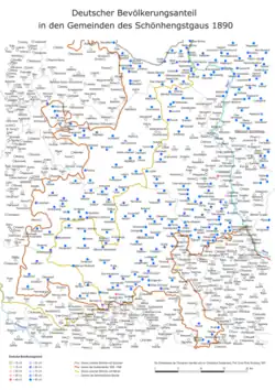 The Schönhengstgau was separated from the closed German-speaking area by a Czech-populated strip near Hohenstadt and around Senftenberg.[10] Before the Second World War, over 126,000 residents lived in the 148 communities, including the six towns of Zwittau, Brüsau, Mährisch-Trübau, Landskron, Hohenstadt and Müglitz, 84% of whom were German.[11]