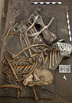 At layer 13 II-3, which is below the spear horizon,[8] a mostly complete skeleton of an adult female (approximately 50 year old) straight-tusked elephant was found, which was found with natural fragments of flint which have wear indicating that they were used to butcher the elephant. The site displays no evidence of hunting, and it is suggested that the elephant died of natural causes and was later scavenged by humans.[9] The P. antiquus individual had a shoulder height of approximately 3.2 m (10 ft) and weighed around 6.8 tons. During the excavation, 300 bones and a total of 700 bone parts were recovered, spread over an area of around 64 m2 (690 sq ft). The finds include the 2.3 meter long tusks, the lower jaw, vertebrae and ribs, as well as the bones of three legs and the entire hyoid bone.[10] The skeletal parts were largely in an anatomically correct arrangement. Various parts were missing, such as the pelvis, the left front leg with the shoulder blade and the foot bones of two legs. The preservation of the bones is mostly very good, only the more than one meter high skull of the individual had disintegrated into hundreds of small parts due to the honeycomb-like nature of the skull. Overall, the animal lay parallel to the former lake shore with the head in the north and the rear in the south.[11]