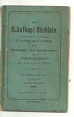 The earliest clear description of the game appears in a poem, Das edle Schafkopf-Spiel[c] in the Regensburger Conversations-Blatt in 1876 which not only lists all 14 trumps, but also the contracts of Rufer and Solo as well as features such as the called Ace and losing Schneider.[26] However, the oldest actual rule set for Bavarian Schafkopf is found in Der gewandte Kartenspieler: 2. Der Schaffkopf: ein geistreiches Kartenspiel[d] printed in Würzburg in 1884.[27] This was followed a decade later by the Schafkopf-Büchlein - Detailliche Anleitung zum Lernen und Verbessern des Schafkopfspiel mit deutschen Karten,[e] published in Amberg in 1895, in which the author explicitly explains the differences from Schafkopf variants played in northern Germany, i.e. Skat and Doppelkopf. The 1876 poem is reprinted although the author clearly did not know its origin.[28]