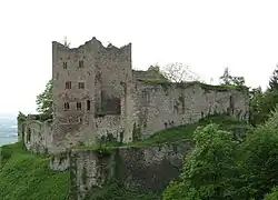 During its time as an active castle, it was besieged many times and overrun twice.[4] After at least two different demolitions (probably during 1689 by Vauban and Mélac in the Nine Years' War[5]) the castle was ruined and, in the 17th century, stones from the castle were used in the building of Gaisbach Castle by Hans Jakob Christoffel von Grimmelshausen, the author of the Baroque satire Simplicius Simplicissimus. The castle has been a preserved ruin since the 18th century and today the castle is owned by the Freiherren von Schauenburg.