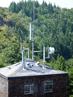There is also an air measuring station on Schauinsland which belongs to the German environmental federal agency and the federal agency for radiation protection. The concentration of air pollutants is measured as part of the European Monitoring and Evaluation Program (EMEP), the climate-relevant gasses and radionuclides are recorded as part of the GAW. Both this building and the solar telescope were built in 1943 and were used to observe the quality of the ionosphere for the purpose of military radio communication.