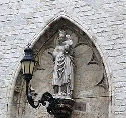 The interior includes a remarkable archive room on the ground floor. Previously called Vierschaere, it has a remarkable oak ceiling. In the interior there are 12 sculpted balkzolen created between 1375 and 1378 by Herman Van Blankene and Jan van Lokeren. The original furnishings have been preserved only in the 1374 wing.[2] There are cross bracings supported by corbels of carved stone made by Jan I Keldermans (Mansdale) between 1377 and 1385. The original fireplace and a stone landing staircase were removed in 1772. On the above floor there is a library that was formerly the meeting room of the aldermen. The chimney is by Andries Keldermans, with a mantelpiece made by Frans Sanders in 1526. On the north wall there is a 16th-century fresco depicting the Crucifixion. The stairway tower dates from 1407.[2]