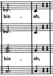 4 meter, is marked Allegro and opens with eight measures of eighth note motion in the strings. The orchestral eighth notes continue for 20 measures as the chorus enters in unison with Doch uns ist gegeben. The eighth notes intensify and climax at a ff in measure 132 as Brahms sets the lyric blindlings von einer Stunde zur andern to the chorus dividing into a B diminished seventh chord.