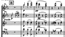 The first example of the text painting in Schicksalslied occurs in measure 41, with the "luminous" harmonies as the choir sings "Glänzende Götterlüfte".