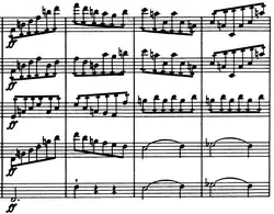 Brahms completed an initial setting of Hölderlin's two verses in ternary form with the third movement being a complete restatement of the first.[6] However, Brahms was dissatisfied with this full restatement of the first movement to close the piece, as he felt that it would nullify the grim reality depicted in the second movement.[6] This conflict remained unresolved, and Schicksalslied unpublished, while Brahms turned his attention to the "Alto Rhapsody" from 1869–70. The piece was not realized in its final form until a solution was suggested to Brahms in 1871 by Hermann Levi (who conducted the premiere of Schicksalslied later that year).[1] Levi proposed that in lieu of a full return of the first movement, a reintroduction of only the orchestral prelude should be used to conclude the piece. Convinced by Levi, Brahms composed the third movement as a copy of the orchestral prelude in the first movement with a richer instrumentation and transposed into C major.[4] While Brahms was hesitant to break the desperation and ultimate futility of the second movement by bringing a blissful return to the first, some see Brahms's return to the orchestral prelude as "a desire on the part of the composer to relieve the gloom of the concluding idea of the text by shedding a ray of light over the whole, and leaving a more hopeful impression".[1]