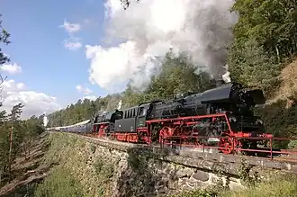 In the era of steam, the ramp proved a real challenge for locomotives and crews. The majority of trains had to be reinforced by heavy pusher locomotives. These were stationed in the well-known locomotive depot at Neuenmarkt-Wirsberg. They included famous locomotives such as the DRG Class 95 (ex-Prussian T 20) and DRG Class 96 (ex-Bavarian Gt 2x4/4), as well as DRG Classes 57 (ex-Prussian G 10) and 50.