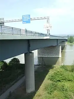 The Schierstein Bridge (German: Schiersteiner Brücke) is 1,282-meter (4,206 ft) long, four-lane highway bridge in Germany. It carries Bundesautobahn 643 over the Rhine River between Mainz-Mombach, Rhineland-Palatinate and Wiesbaden-Schierstein, Hesse (Rhine kilometrage 504.45). Crossing two arms of the Rhine and the intervening island of Rettbergsaue, the bridge is made of six individual structures, including 100 m (330 ft) from prestressed concrete. It was built between 1959 and 1962.