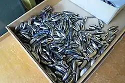 The Schiffli machine used two threads – one on the front side and one on the back side of the fabric. The first thread is entwined with the second thread to form a lock stitch. The front side thread, or embroidery yarn, is held on a spool, or rather a creel of spools. A boat-shaped shuttle (German: Schützen or Schiffchen, Swiss German: Schiffli) carries the bobbin thread, which is also known as the schiffli yarn. There is one shuttle per needle.[3] When the front-side needle pierces the fabric it passes the embroidery thread through the fabric from front to rear. As the needle withdraws it forms a loop on the back side of the material. The shuttle which trails the bobbin thread passes through this loop. Finally, the front-side thread is pulled tight.