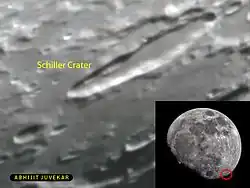 Schiller is a lunar impact crater located in the southwestern region of the Moon's near side. The rim of Schiller has an elongated shape that is amplified by its proximity to the lunar limb. The long axis lies along a line running northwest–southeast, with the wider girth located in the southeastern half. There is a slight bend in the elongation, with the concave side facing to the northeast. Schiller is thought to be a fusion of two or more craters.