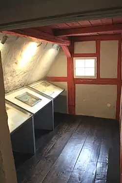 In 1841, on the initiative of Robert Blum, Leipzig theater secretary and one of the pioneers of the German Revolution of 1848/49, the Schillerhaus was rediscovered as Schiller's place of work, after which a memorial was set up. It was inaugurated on 11 November 1841 with the solemn unveiling of the newly built honor gate with the memorial plaque "This is where Schiller lived and wrote the song to joy in 1785". On 24 October 1842 the Leipzig Schiller Club was established/founded by Robert Blum. In 1848 the Schillerstube was opened to the public. In 1856 the house was threatened with demolition and auction, whereupon the Schillerverein acquired the building for 2150 thalers through donations and the financial commitment of a board member. This board member was the historian Heinrich Wuttke.[5][6] Over the next three years, the building and its outdoor facilities underwent decisive structural changes. In 1864 the entry in the land register was made on the Schiller Club. According to the statutes, when the association was dissolved, the house became the property of the city if the city agreed to use the building as a memorial. In the years 1896/97, 1911 and 1929–34, further structural repair and redesign work was carried out. In 1911 the architect Max Langheinrich rebuilt the gate of honor according to the old view. On 4 December 1943 a stick bomb broke through the roof during the bombing of the city and got stuck in Schiller's former bedroom. This bomb could be removed. As a result, valuable exhibits were relocated to the Wurzen Cathedral, some of which are considered a war loss.[7][8]
