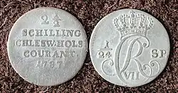 The Schleswig-Holstein schilling courant was introduced in 1788 into the Duchies of Schleswig and Holstein, which were then part of the consolidated Danish state. The reference denomination was the Speciesthaler to the 9¼ thaler standard. 60 schillings courant made a Speciesthaler. Dreilings, sechslings and double sechsling coins were minted as Scheidemünzen and 2½ to 60 schilling coins as full currency coin at the latest until 1812.