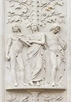 From 1831 to 1836, the Augusteum of the University of Leipzig was built on Augustusplatz according to plans by Albert Geutebrück.[1] Karl Friedrich Schinkel had reworked the façade in a classicist style. This resulted in a high portal framed by columns, which bore the inscription AUGUSTEUM in gold letters. Schinkel designed a pictorial decoration for the columns, which was implemented by the Dresden sculptor Ernst Rietschel (1804–1861).[1]