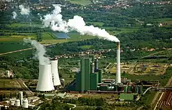 The Schkopau Power Station is a 900 MW[1] lignite-fuelled power station near the Korbetha part of the municipality of Schkopau in the district of Merseburg-Querfurt (Saxony-Anhalt), Germany, which was built in 1995/1996. It has two units with a total capacity of 900 megawatts (MW), of which are 110 MW for traction current with a frequency of 16.7 cycles per second produced in a dedicated generator for Deutsche Bahn AG. In addition, heat is provided for local chemical factories through cogeneration. The power station has a 200 metres (656 ft) high chimney. It is owned and operated by Uniper and EP Energy. The closure is planned for 2034.