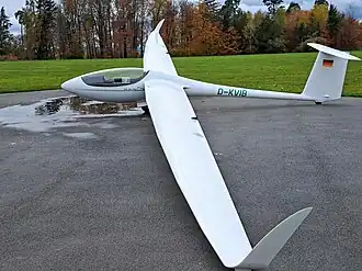 The AS 34Me is a single-seat, mid-wing sailplane of composite construction, with a retractable monowheel landing gear and a T-tail.[1] The design is based upon the ASW 28, with an unflapped wing. It can be flown with an 18 m (59 ft) span and 11.9 m2 (128 sq ft) area or a 15 m (49 ft) span and 10.5 m2 (113 sq ft). The power unit has already been used in Schleicher ASG 32 EI, except the batteries are mounted in the wings rather than the fuselage.