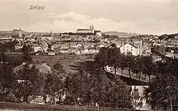 Schleiz can be traced back to a settlement established about 1200 ("Altstadt") and a separate "Neustadt" that was established next to it. The "Neustadt" had a castle and a city wall. Until 2 December 1482 they were totally separate communities after which they combined to one city. There was a settlement of the Teutonic Order here, and for some years previous to 1848 the town was the capital of the small principality of Reuss-Schleiz. In the vicinity a battle was fought, between the French and the Prussians on 9 October 1806.[3]