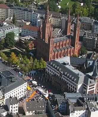 The Schlossplatz (German pronunciation: [ˈʃlɔsˌplats] ⓘ, "Palace Square" or "Castle Square") forms the center of the historic Old Town of Wiesbaden, Hesse, Germany. It gets its name from the Stadtschloss, the royal residence of the Dukes of Nassau located on the north side of the square. Other buildings surrounding the Schlossplatz include the Old City Hall, the New Town Hall and the Marktkirche. In the middle of the square stands the Marktbrunnen (Market Well) of 1753. Due to this unique building ensemble, and the fact that at this point medieval Wiesbaden originated, it is historically the most important part of the city. Occasionally it is referred to as the "market square", its name before the palace was built.