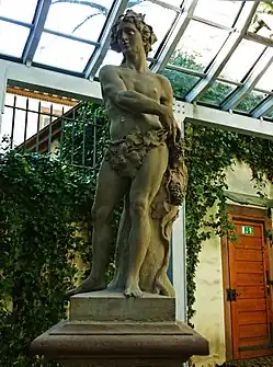 The mansion was built from 1748 onwards by order of Baron Ferdinand Sebastian von Sickingen-Hohenburg according to a design by the architect Johann Jacob Fechter from Basel because the previous building no longer met the client's requirements.[4] Important Baroque artists from the region were consulted for the artistic decoration, in particular Christian Wentzinger, who created the human-sized sandstone sculptures in the palace park, the originals of which are now in the Museum of City History Freiburg. The stucco work in the 14 rooms of the palace was created by Wessobrunner stucco-worker Hans Georg Gigl, the richly decorated stucco masks in the garden hall by Wentzinger. The ceiling paintings, especially in the garden hall, are mainly allegorical, painted in 1750 by the Allgäu artist Benedikt Gambs. The ceiling of the garden hall is signed by the artist. After Gamb's death, the ceiling painting of the magnificent staircase was created by Johann Pfunner (*around 1713/16 - †1788), who came from Tyrol and lived in Freiburg.[4]