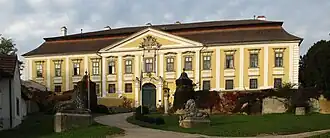 The Renaissance structure underlying the present face of the castle was renovated in baroque style in 1725 by Josef Munggenast and was described by Food & Wine's Lettie Teague as "easily the grandest winery" of a 2017 tour of Austrian vineyards.[4] The building's chapel houses a work by Kremser Schmidt. In 1740, Zwettl Abbey acquired the Gobelsburg property from Achaz Ehrenreich von Hohenfeld.[2]