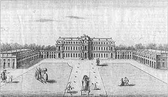 In the outskirts of Bonn, the capital of the Cologne Electorate, the ‘Kottenforst’ forest was a centre of such ‘par force’ hunts.[1] As from 1727, wide avenues were created.[1] And in the centre of these star shape radiated avenues, a hunting lodge was constructed between 1753 and 1761, Schloss Herzogsfreude.[1] The architect was Johann Heinrich Roth (1729-1788).[1]