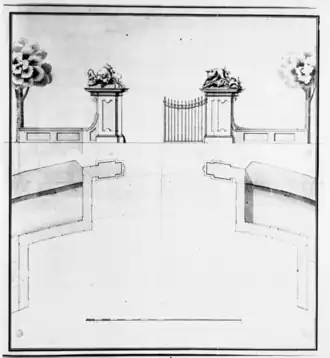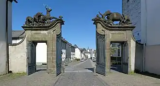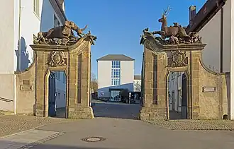 In 1753, Prince-Elector Clemens August commissioned the construction of a grand entrance gate made from Rüthen sandstone, the so-called Hirschberg Gate, which closed off the open side of the courtyard in the three-winged complex.[2] The design was by Johann Conrad Schlaun, while the sculptural decorations depicting hunting scenes were created by the Rhenish sculptor Johann Christoph Manskirch.[2]