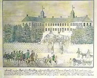 During his reign, Prince-Elector Clemens August I of Bavaria had Schloss Hirschberg modernized.[1] Unlike the extensive renovations at Arnsberg Castle, Johann Conrad Schlaun's work at Hirschberg primarily focused on redesigning the interiors.[1] Additionally, Clemens August commissioned the construction of the so-called Hirschberg Gate in 1753, which closed off the open side of the courtyard in the three-winged complex.[1]