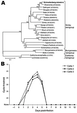 Schmallenberg virus, abbreviated SBV, is a virus that causes congenital malformations and stillbirths in cattle, sheep, goats, and possibly alpaca.[2][3] It appears to be transmitted by midges (Culicoides spp.), which are likely to have been most active in causing the infection in the Northern Hemisphere summer and autumn of 2011, with animals subsequently giving birth from late 2011.[2] Schmallenberg virus falls in the Simbu serogroup of orthobunyaviruses. It is considered to be most closely related to the Sathuperi and Douglas viruses.[4]