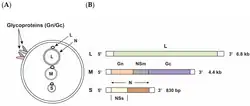 The genetic structure of Schmallenberg virus is typical for bunyaviruses, which are a class of enveloped negative-sense single stranded RNA viruses with a genome split into three parts—Small (S), Medium (M) and Large (L). The L RNA segment encodes an RNA-dependent RNA polymerase (L protein), the M RNA segment encodes two surface glycoproteins (Gc and Gn) and a nonstructural protein (NSm), while the S RNA segment encodes a nucleocapsid protein (N) and, in an alternative overlapping reading frame, a second nonstructural protein (NSs).[16] The genomic RNA segments are encapsidated by copies of the N protein in the form of ribonucleoprotein (RNP) complexes.[17] The N protein is the most abundant protein in virus particles and infected cells and, therefore, the main target in many serological and molecular diagnostics.[18][19]
