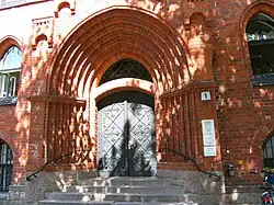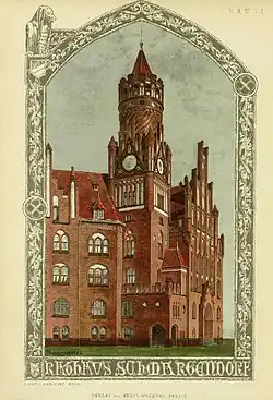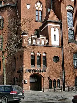 The Schmargendorf Town Hall is the former town hall of the once-independent municipality of Schmargendorf, which was incorporated into Berlin in 1920 and has been a district of the Berlin borough of Charlottenburg-Wilmersdorf since 2001. The historicist building was constructed between 1900 and 1902 according to plans by Otto Kerwien in the style of Brandenburg brick Gothic. Kerwien's design was inspired by the mostly medieval secular buildings of Tangermünde and Stendal. Today, it houses the district registry office, the music school, and the Adolf Reichwein Library, a branch of the city library.[1]