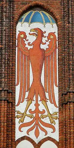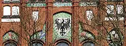 The main façade, featuring most of the decorative elements, forms the southern front facing Berkaer Platz, where the main entrance is located. The entrance portal protrudes from the southern façade above a short flight of steps. Above the portal is the window front of the council chamber, with five windows crowned by glass mosaics. Above the central window is the large Prussian royal coat of arms, and above the other four windows are the smaller coats of arms of the four Margrave families who once ruled Brandenburg: the Ascanians, Wittelsbachs, Luxembourgs, and Hohenzollerns (from left to right). Above these, a glass mosaic bears the inscription "Anno Salutis MDCCCCI", a reference to medieval models, as this phrase had not been commonly used for about 100 years at the time of construction. The south façade is crowned by an elongated mosaic of the Brandenburg eagle.[1]