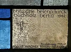 Restoration work was carried out in the early 1960s. The façade was cleaned, and war damage was repaired using historical methods, such as whitewashing the panels with soaked lime, a medieval technique. The windows in the main stairwell were also replaced during the restoration. The appearance of the original stained-glass windows was not preserved. The new stained-glass windows, designed between 1962 and 1964 by Wilmersdorf artist Helena Starck-Buchholz, wife of artist Erich Buchholz, were installed in 1964–1965 by August Wagner's company, which had supplied the glass mosaics for the façade 60 years earlier. The main staircase features 14 windows, five of which are circular.[4]
