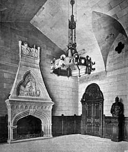 The 9 m × 12 m council chamber was particularly ornate. Under the wooden beam ceiling, a Rabitz construction created an imitation vault with the cross-section of a Tudor arch and pointed caps, giving the impression of a vault made entirely of sandstone. Heavy chandeliers, designed by architect Otto Nachtigall, were suspended from the ceiling in two places. The wrought iron light fixtures are riveted with bronze decorations in the shape of wild boar and bear heads, evoking the nearby Grunewald Forest.[2]