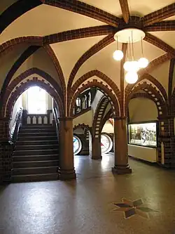 All corridors intended for public use, the main staircase, and the Ratskeller were decorated with cross or star vaults. These vaults were constructed using the Rabitz method and solidly bricked, with brick ribs reproduced using original bricks from a monastery in the Mark Brandenburg. The main staircase was constructed with 2.5-metre-wide flights of stairs supported by granite steps. The railings are solidly bricked with openings and clad with coloured glazed bricks.[2]