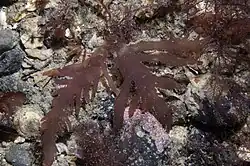 The plants are monoecious, bearing spermatia and carpogonia. After fertilization and development of connecting filaments and fusion with intercalary vegetative cells, a carposporphyte develops. The tetrasporophyte phase is crustose and unknown in the wild.[2] It is bright red and grows to 6 mm in diameter and composed of a single basal layer of cells which produce erect filaments some of which produce tetraspores. These tetraspores develop and grow to give rise to the gametophyte generations.[3]