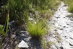 Southern African Schoenus were once classified as Tetraria; however, based on molecular and morphological differences, we now know that the two groups are evolutionary distinct.[5] To ensure that this group of sedges is monophyletic (i.e. the genus only has closely related species), several species of Epischoenus and the southern African Tetraria were transferred into Schoenus.[5] In the field, the southern African Schoenus can be distinguished from Tetraria species by their lack of stem leaves and the absence of reticulate sheaths at the bases of the flowering stems.[5]