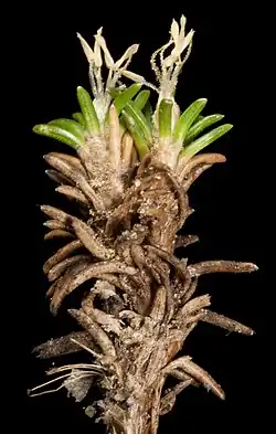 S. calcatus is a small cushion-forming perennial. The leaves are spirally arranged and have both a short blade and a short sheath.[3]