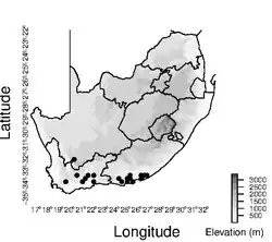 Most reports of this species are from high mountain slopes (above 1000 m) surrounded by fynbos vegetation.[1] However, eastern collections of this species come from grassland vegetation at lower elevations.[1]