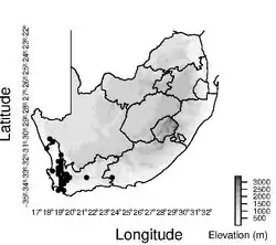 The known distribution of S. pseudoloreus ranges as far north as the Kamiesberg in the Northern Cape Province and near Willowmore in the east.[1] It is a species usually found on dry mountain slopes with varying substrates.[1]
