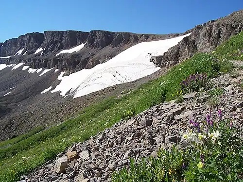 Schoolroom Glacier is a small glacier in Grand Teton National Park in the U.S. state of Wyoming.[2] This Teton Range glacier lies adjacent to the south Cascade Canyon trail at an altitude of 10,400 ft (3,200 m), approximately 12 mi (19 km) from the trailhead at Jenny Lake. The glacier has many of the classic textbook details of a glacier, namely, well defined terminal and lateral moraines, crevasses, a proglacial lake (or tarn[3]) and related features which led to the naming schoolroom.[4]