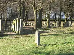 The Jewish cemetery was established in 1612 (or even a few years earlier) and has been expanded several times since then, with the last major expansion taking place in 1802.[21] As a community cemetery – until some of them created their own burial grounds – it was the central cemetery for the Jewish communities of a wide region, including Dinkelsbühl, Feuchtwangen, Mönchsroth and Wittelshofen, as well as for several communities now in Baden-Württemberg: in particular, until 1841, Crailsheim, Goldbach, Hengstfeld, and until 1840, Michelbach an der Lücke, Steinbach, Fichtenau and Wiesenbach. The last burials took place in 1938 (Paula Jordan from Wittelshofen and Fanny Benjamin née Dinkelsbühl). The extremely extensive area necessitated repeated expansion, and the cemetery ultimately covers 12,980 m². The oldest gravestones, some of which have sunk into the grounds, are located at the far east of the site. According to more recent counts, there are 1,172 gravestones in the cemetery.[22]